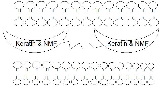 Чешуйки рогового слоя соединены друг с другом с помощью белковых структур – корнеодесмосом. Чешуйки окружены липидным матриксом, имеющим двухслойную структуру. Двухслойные липидные слои располагаются параллельно поверхности кожи и являются уникальной структурой, свойственной коже, обеспечивая её барьерные функции. Липидный барьер препятствует проникновению патогенов, аллергенов и других веществ, а также молекул с высоким молекулярным весом. Доставка соединений с высоким молекулярным весом в составе косметических средств к живым клеткам нижних слоев эпидермиса затруднена, если не невозможна благодаря защитной функции липидного барьера, что необходимо учитывать при разработке подобных средств. Пространство между липидным бислоем и корнеоцитами является водным.
