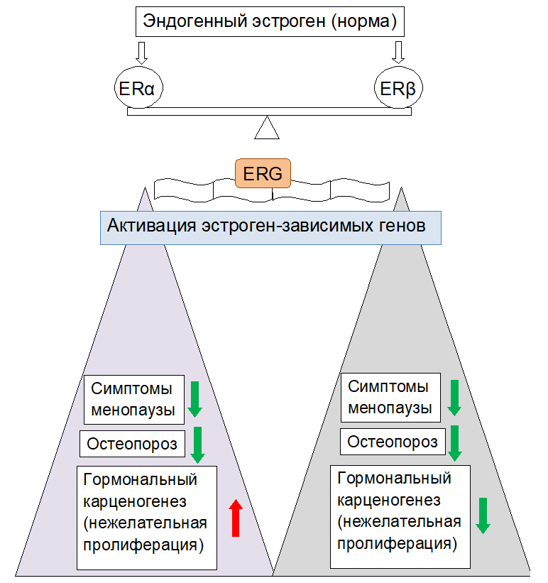На клеточном уровне действие эстрогенов происходит через специальные эстрогеновые рецепторы (ER). Есть 2 типа таких рецепторов – альфа и бета (ERα и ERβ). Эстрогены, связываясь со своими рецепторами, активируют процессы транскрипции генов (ERG), ответственных за нормальные физиологические функции. В норме рецепторы взаимодействуют согласованно. Эффекты, опосредованные ERα рецепторами, снижают проявление симптомов менопаузы, но увеличивают пролиферацию в гормонзависимых тканях. При активации ERβ генов симптомы менопаузы также снижаются при одновременном подавлении пролиферации.