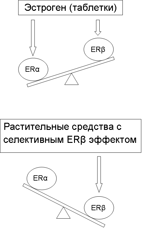 При применении средств заместительной терапии с неселективной ER активностью или селективной ERα активностью как синтетического (эстроген/таблетки) так и растительного происхождения есть риски нежелательной пролиферации в гормонзависимых тканях. Средства растительного происхождения с селективной активацией ERβ рецепторов могут представлять собой более безопасную альтернативу традиционной гормональной терапии когда есть риск преобладания ERα-опосредованных пролиферативных эффектов.