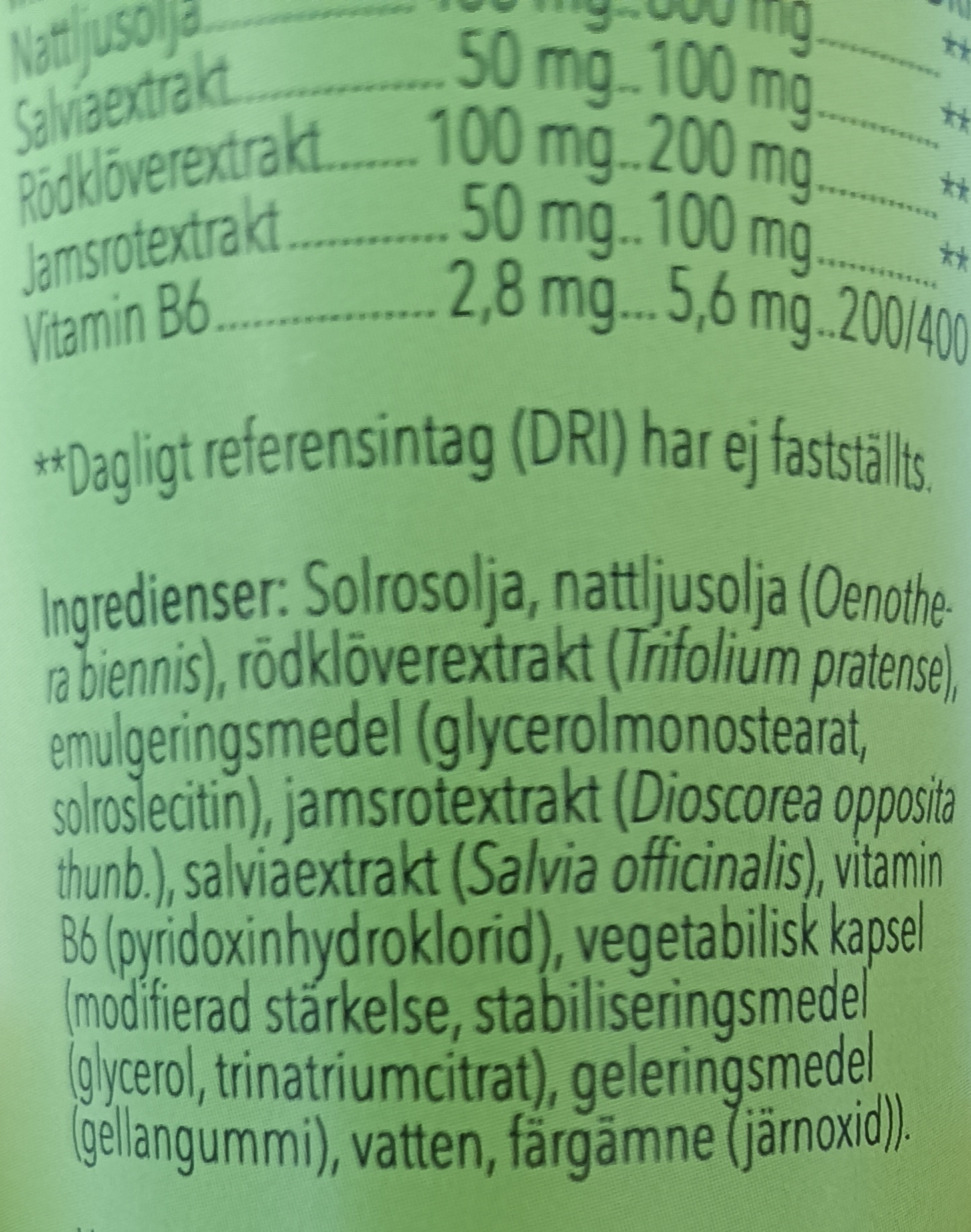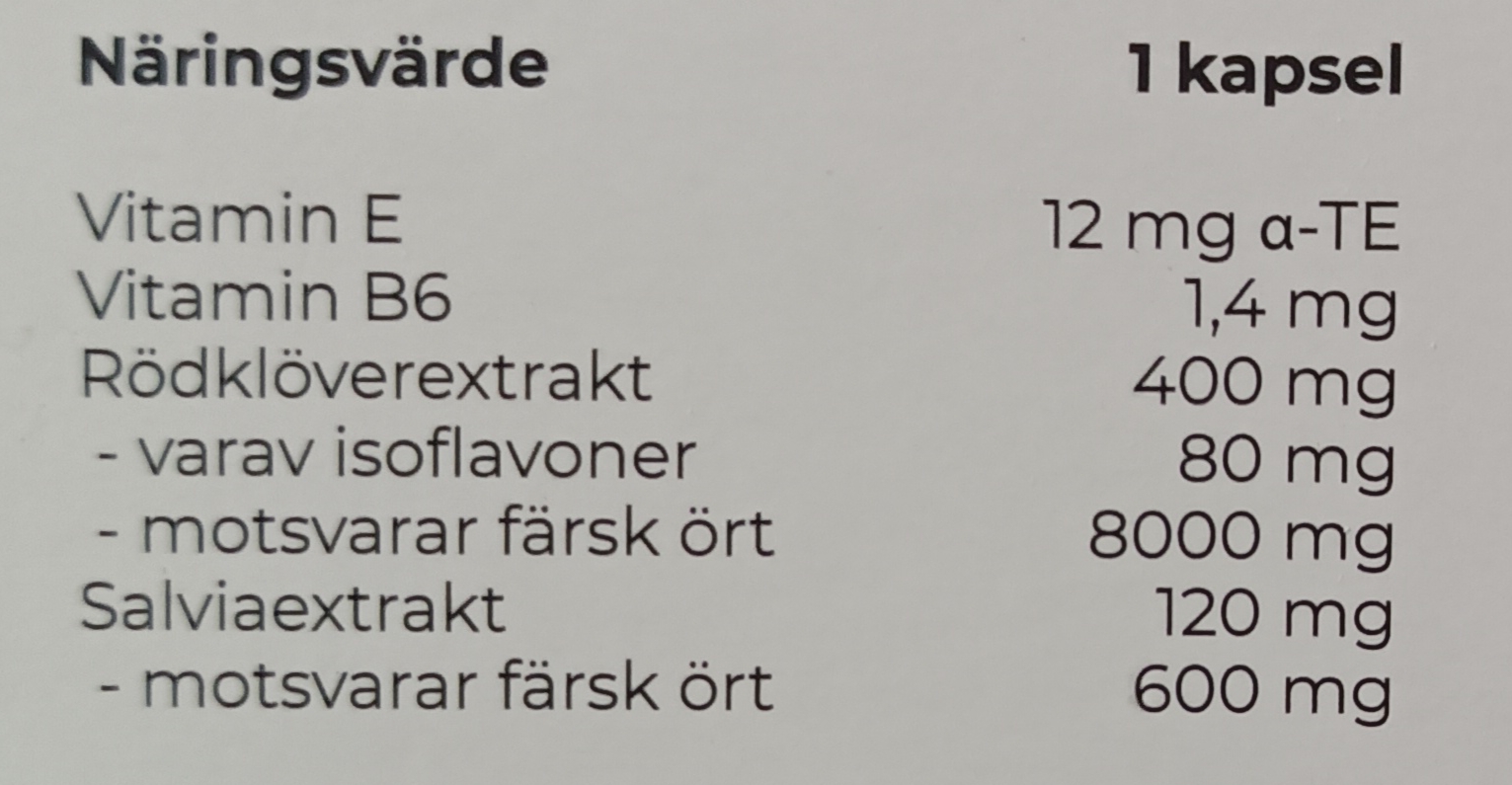 7. Oenothera biennis (evening primrose, ослинник двулетний или примула вечерняя, nattljus). Примула вечерняя является хорошим источником омега-6 жирных кислот, включая γ-линоленовую кислоту (γ-linolenic acid). В исследовании, проведённом с участием 56 женщин, были отмечены значительные положительные результаты в облегчении симптомов приливов. Однако систематические обзоры указывают на отсутствие клинически значимых эффектов, несмотря на хорошую переносимость.