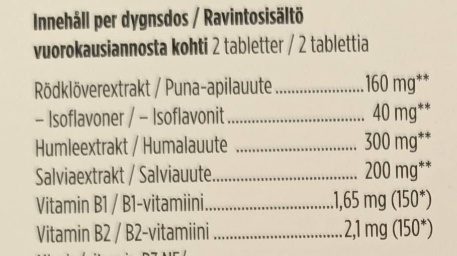 - Trifolium pratense (Red Clover, клевер луговой, rödklöver). В отличие от сои изофлавоны клевера представлены проэстрогенами биоханином А (biochanin A) и формононетином (formononetin). Эти прекурсоры подвергаются метаболизму в кишечнике и печени и тоже с образованием ERβ-селективных генистеина и даидзеина. Однако изофлавоны клевера обладают большей биодоступностью в сравнении с изофлавонами сои. Это в свою очередь может служить объяснением большей эффективности средств, содержащих клевер, в опубликованных клинических исследованиях. Соя и клевер наиболее часто встречаются в растительных средствах эстрогенного действия для облегчения симптомов менопаузы. Есть и другие растения.
